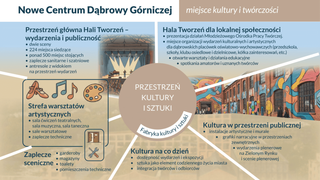 W Dąbrowie Górniczej rozumiemy bowiem, że tożsamości nie da się kupić – trzeba ją cierpliwie wydobyć spod warstw starych cegieł. Przykładem tego jest Hala Tworzeń, która z dawnej montowni zmieni się w wielofunkcyjny „salon miasta”, dedykowany koncertom, targom i twórczej pracy młodzieży.