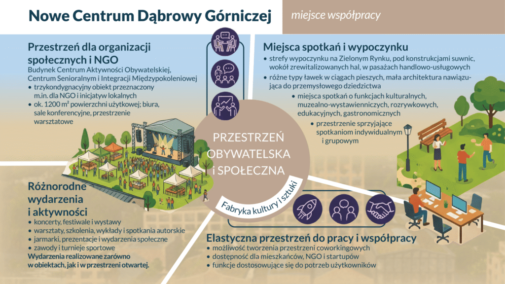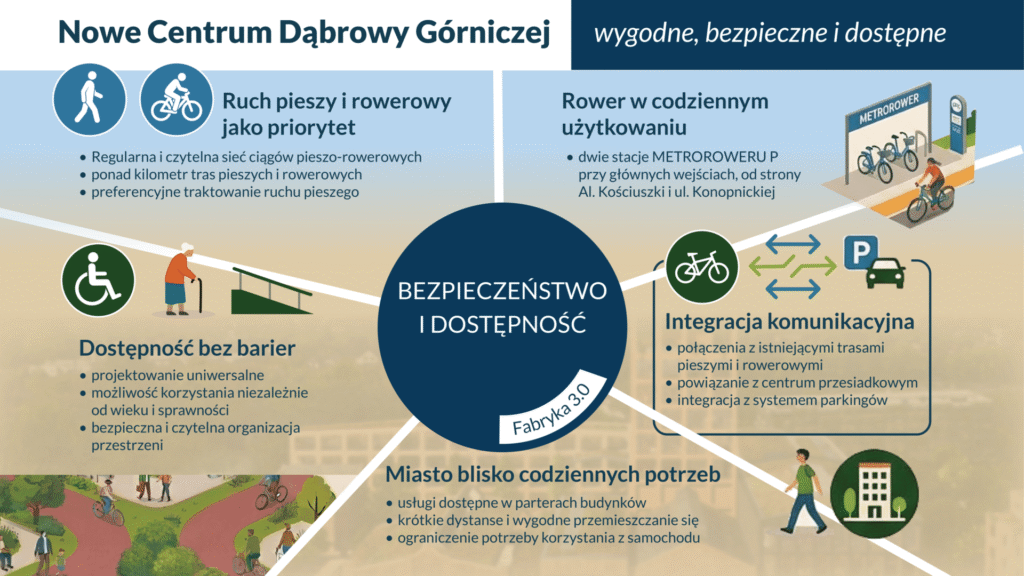 Całe założenie nowego centrum Dąbrowy Górniczej opiera się na łączeniu różnych funkcji w jednej, spójnej przestrzeni. Nie chodzi o to, żeby tworzyć oddzielne strefy, które żyją tylko o określonych porach dnia, ale o miejsce, które działa cały czas i odpowiada na różne potrzeby mieszkańców.