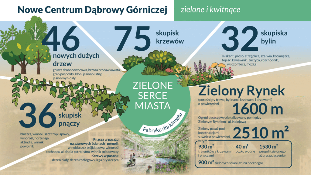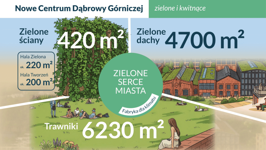 Mówimy o stworzeniu ponad 7 tysięcy metrów kwadratowych nowoczesnych terenów zielonych, co sprawi, że prawie 40% całego obszaru zyska status powierzchni biologicznie czynnej. To nie tylko estetyka, ale realny wpływ na mikroklimat i jakość życia w centrum – efekt ten spotęgują zielone dachy o łącznej powierzchni kilku tysięcy metrów, które naturalnie ochłodzą budynki i zatrzymają wodę. Nowe centrum Dąbrowy Górniczej to także ponad dwa hektary atrakcyjnych przestrzeni publicznych oraz tysiące metrów kwadratowych oddanych we władanie kultury, handlu i usług. Wszystko to, w niedalekiej przyszłości, zostanie dopełnione przez dodatkowe funkcje biurowe i mieszkaniowe, tworząc spójny i kompletny ekosystem.