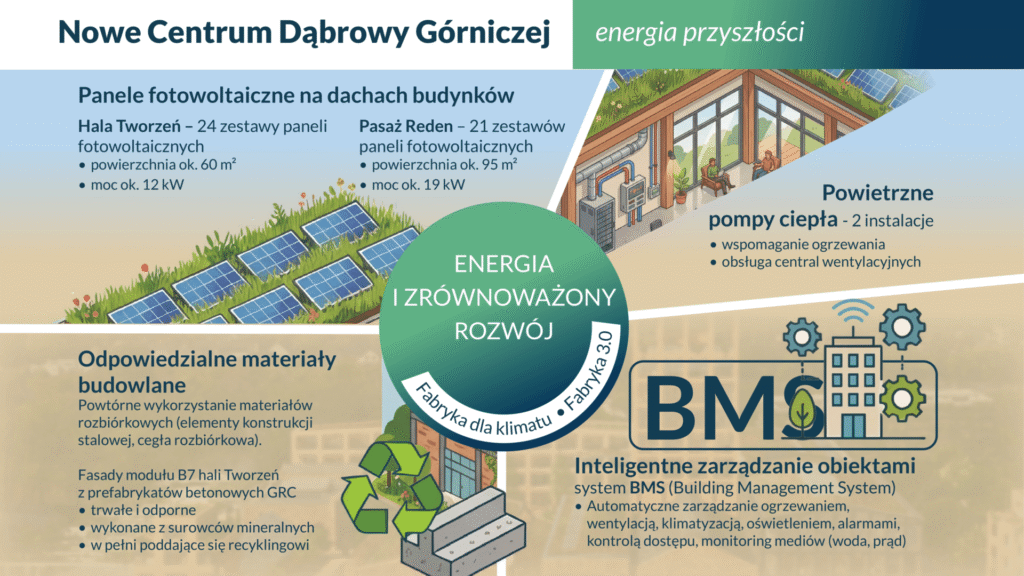 Nowe centrum Dąbrowy Górniczej zostało zaprojektowane tak, żeby jak najlepiej wykorzystywać dostępne zasoby i ograniczać straty energii tam, gdzie to możliwe. W praktyce oznacza to połączenie kilku rozwiązań, które wzajemnie się uzupełniają.