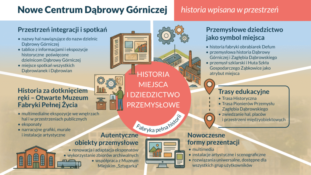 Projekt, realizowany we współpracy z Muzeum Miejskim „Sztygarka”, zaoferuje kilka tras tematycznych – m.in. Trasę Historyczną oraz Trasę Pionierów Przemysłu Zagłębia Dąbrowskiego. Poprowadzą one przez place, hale i pasaż, budując kontekst miejsca. Pamięć o lokalnej tożsamości przemycono nawet w nazewnictwie – hale odwołują się do dzielnic miasta i słynnych zakładów, jak Huta Szkła Gospodarczego w Ząbkowicach. W efekcie historia przestanie być zamkniętym rozdziałem w zakurzonej sali; stanie się częścią nowoczesnego krajobrazu, dostępną dla każdego na wyciągnięcie ręki.